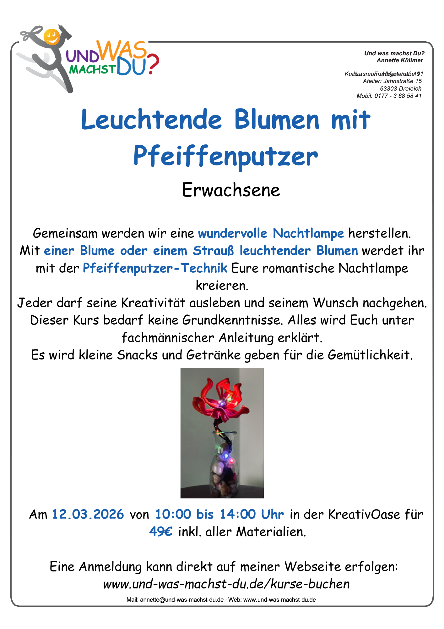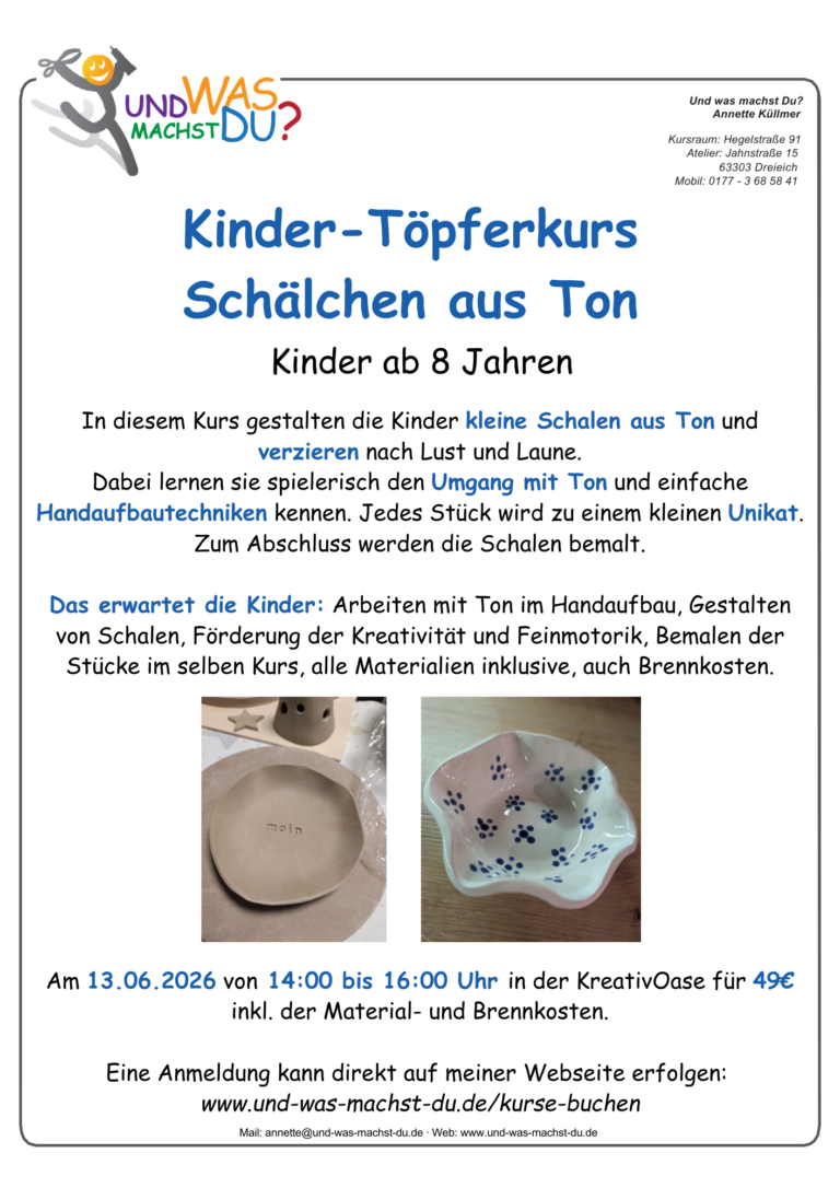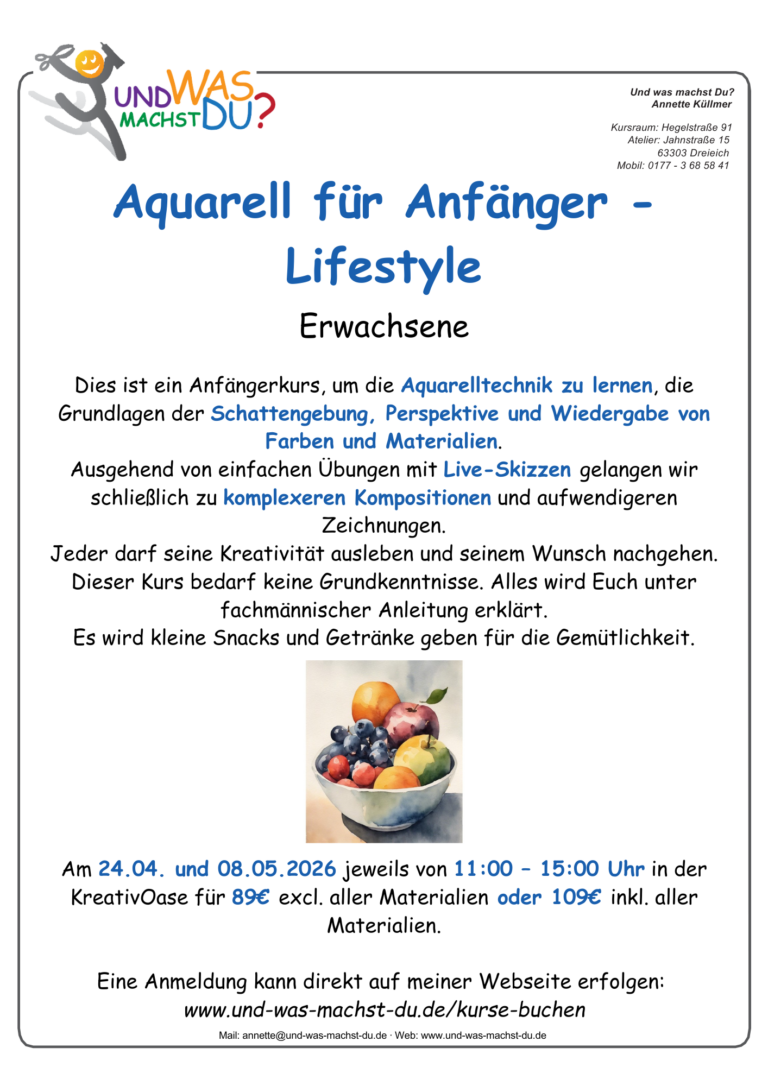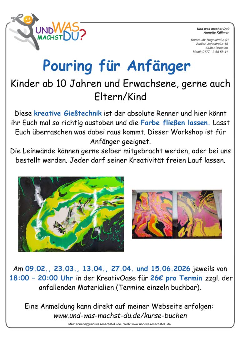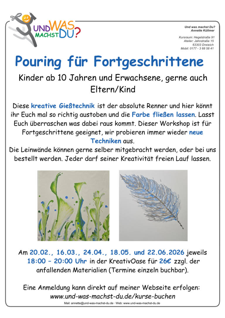 Möchten Sie sich morgens oder abends einmal wieder Ihrer künstlerischen Ader widmen? Finden Sie die Zeit zu Hause nicht? Basteln Sie gerne in einer Gruppe? Dann sind Sie zu meinen Kreativworkshops genau richtig!