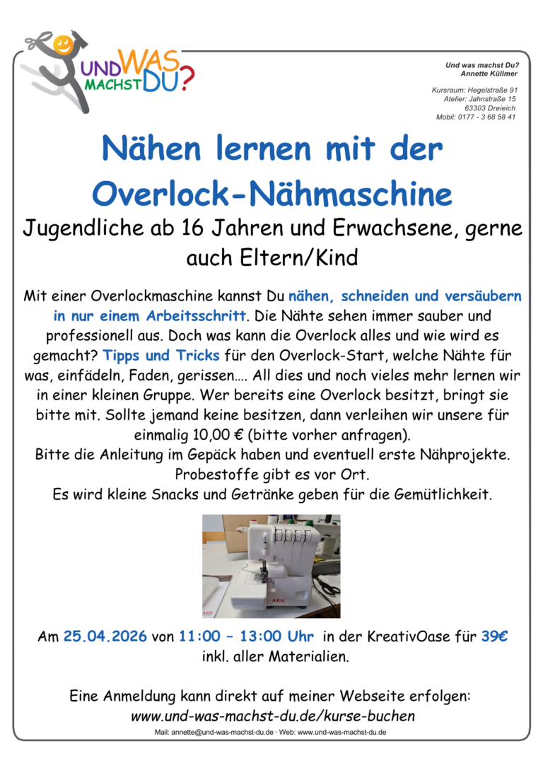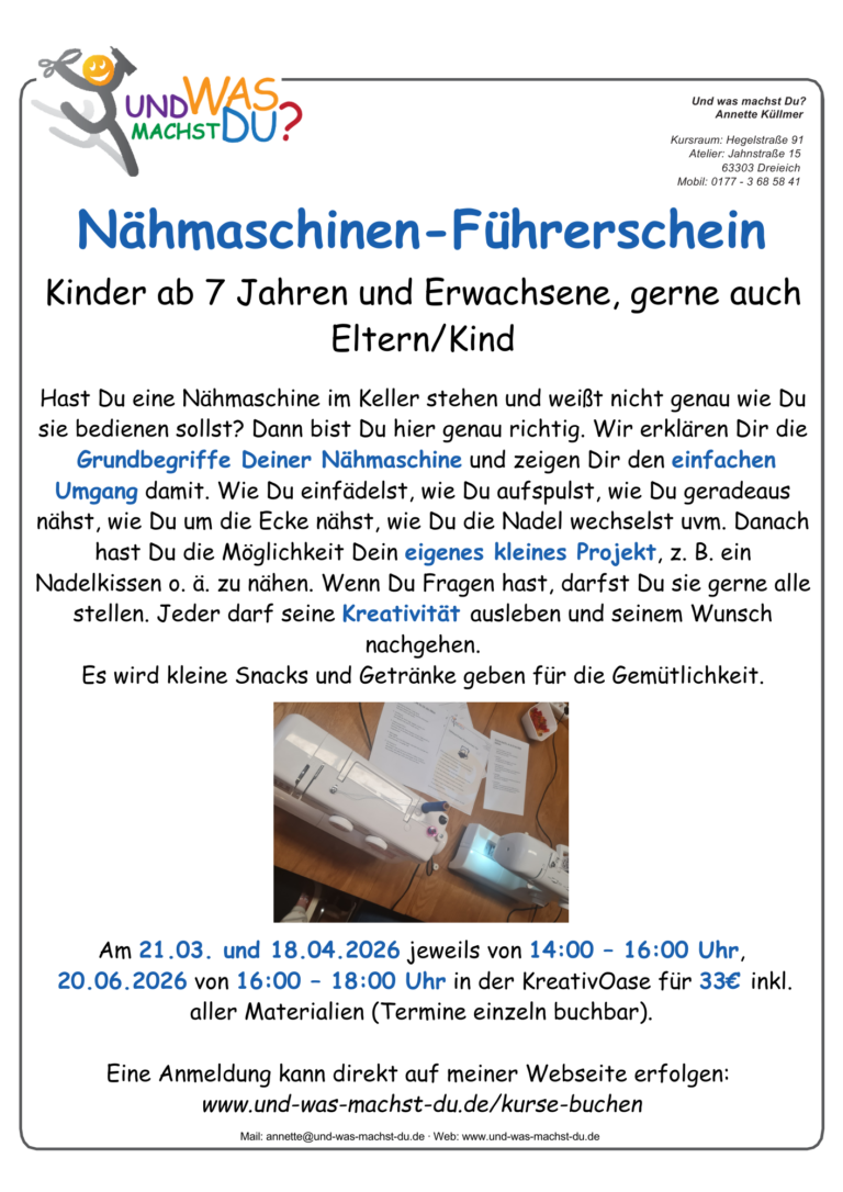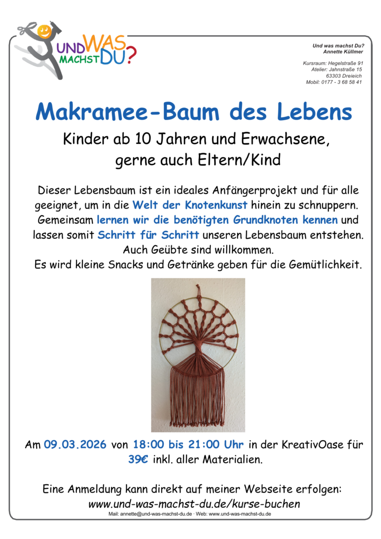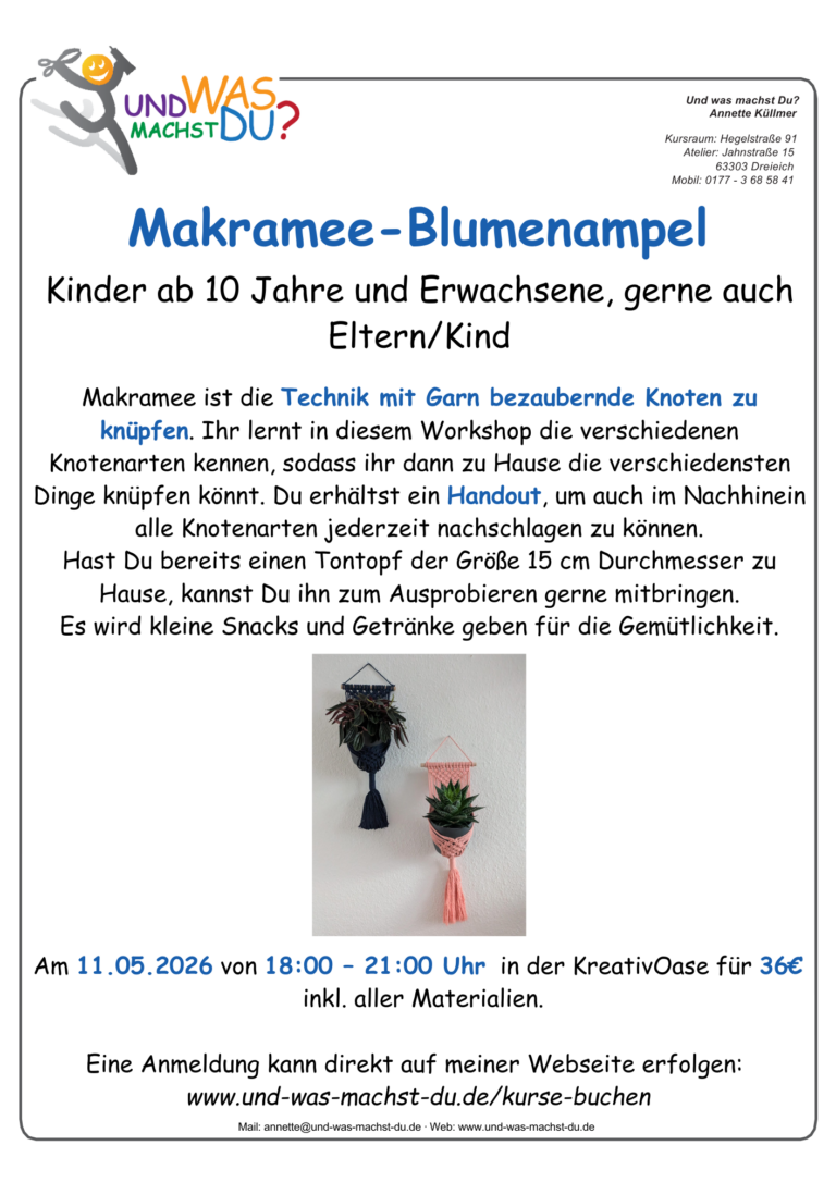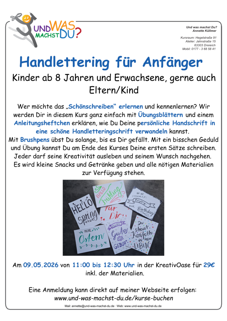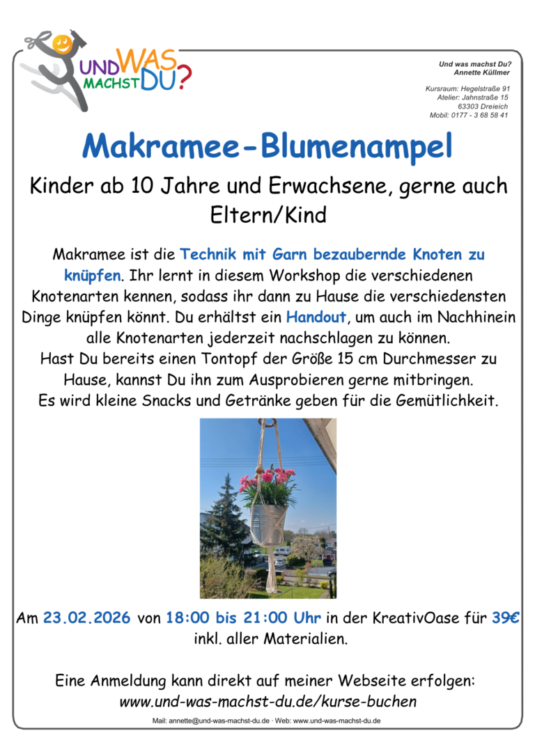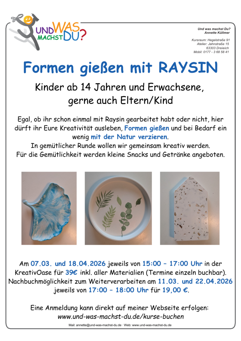 Vom Nähen zum Basteln über Makramee, Mosaik, Töpfern, Pouring, Raysin, Handlettering und kreativem Gestalten ist hier alles dabei.