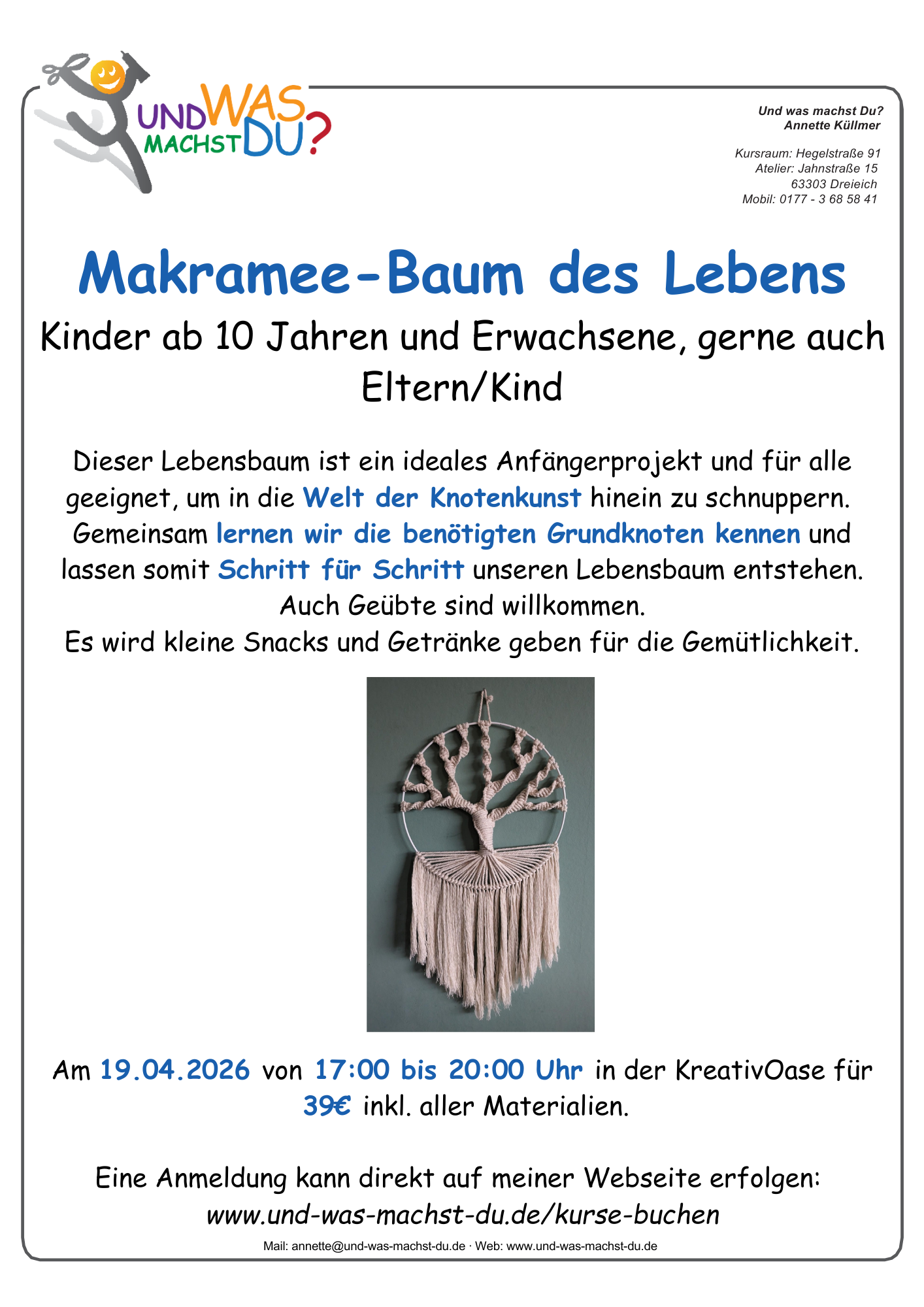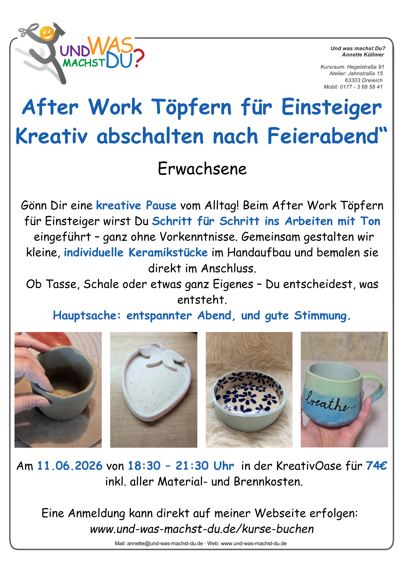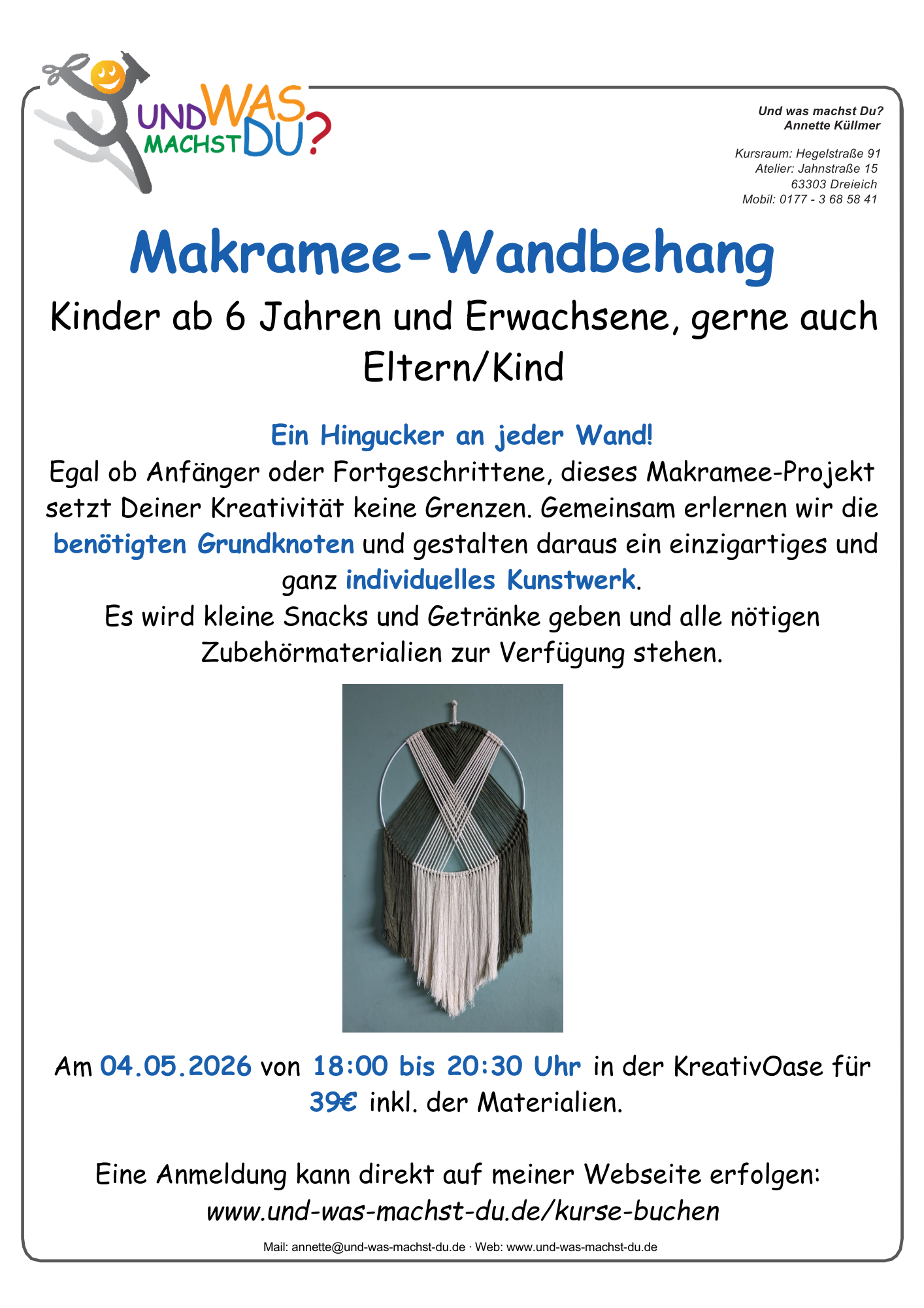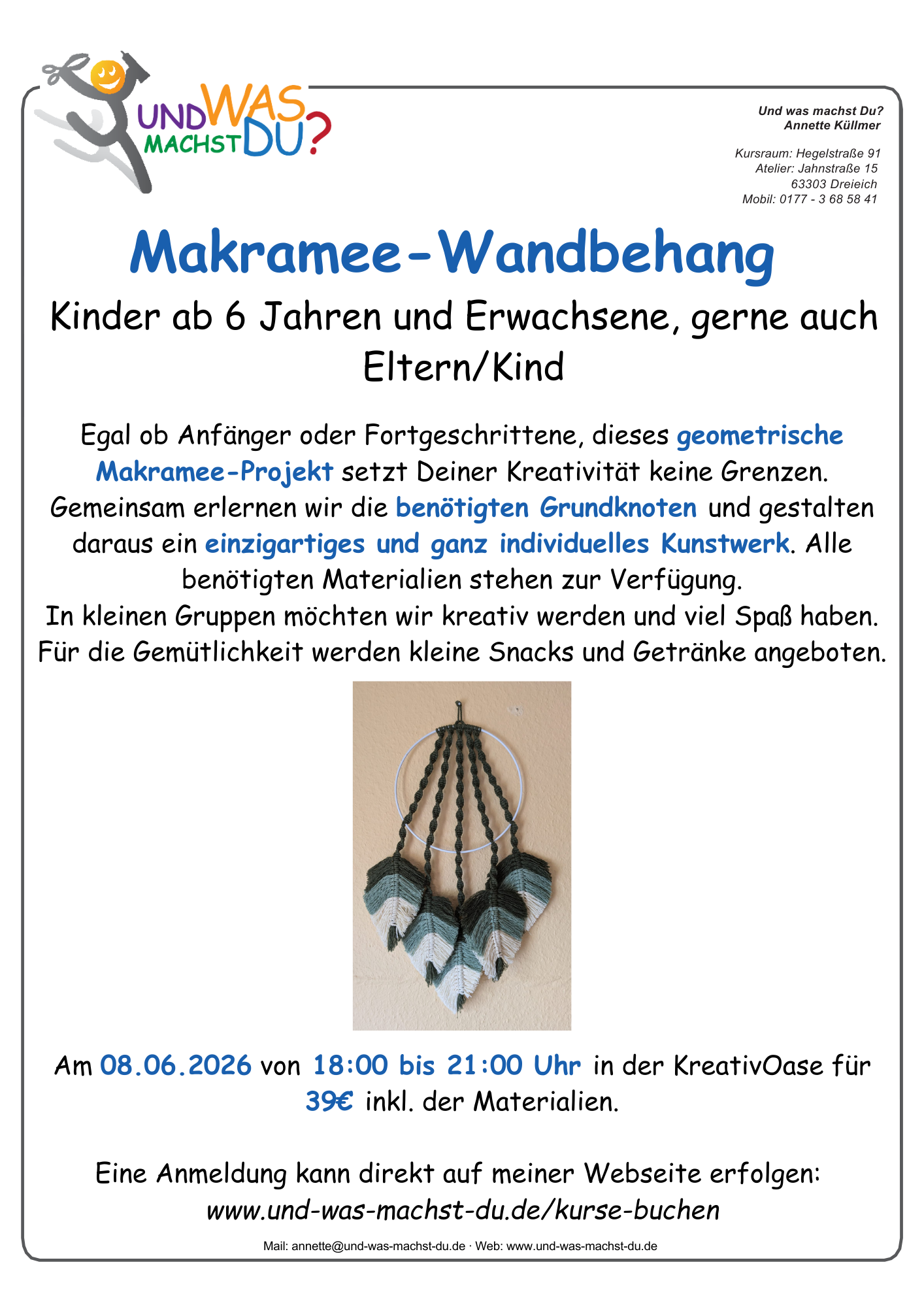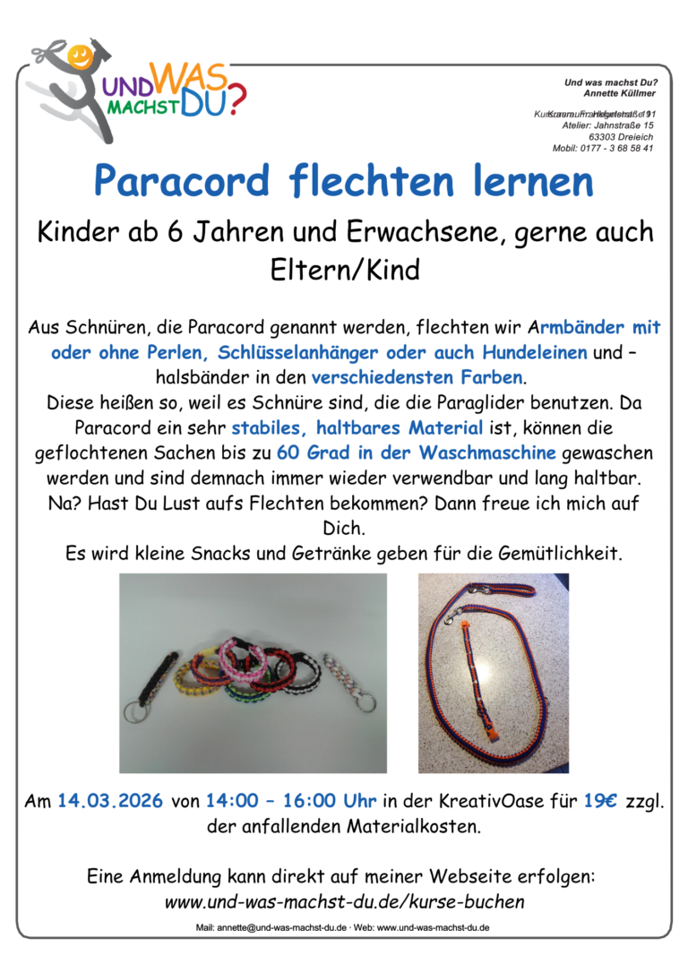 Vom Nähen zum Basteln über Makramee, Mosaik, Töpfern, Pouring, Raysin, Handlettering und kreativem Gestalten ist hier alles dabei.